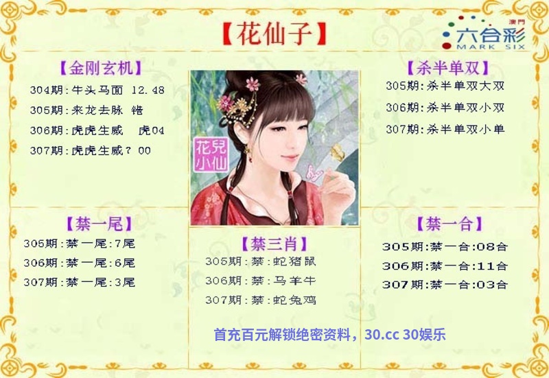 【花仙子解传真】307期:今期生肖一二开,老牛骑马倒着走。十有八九输在此,一句鬼话说前头。龙王落水取灵码,一三四二三合到。佳成一唱好才文,鲜鱼只愿水中养